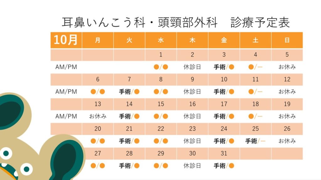 2025年10月耳鼻いんこう科・頭頸部外科予定表がでました!遅くなり申し訳ございませんm(_ _)m