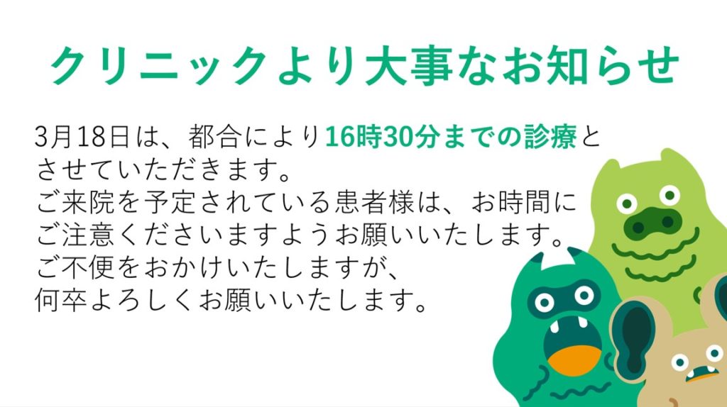 3月18日は、耳鼻いんこう科・頭頸部外科、ペインクリニック内科ともに16:30までの診療を行います